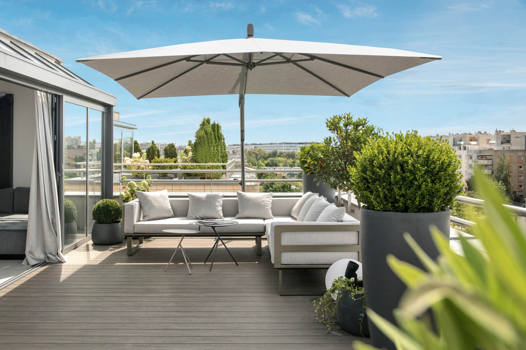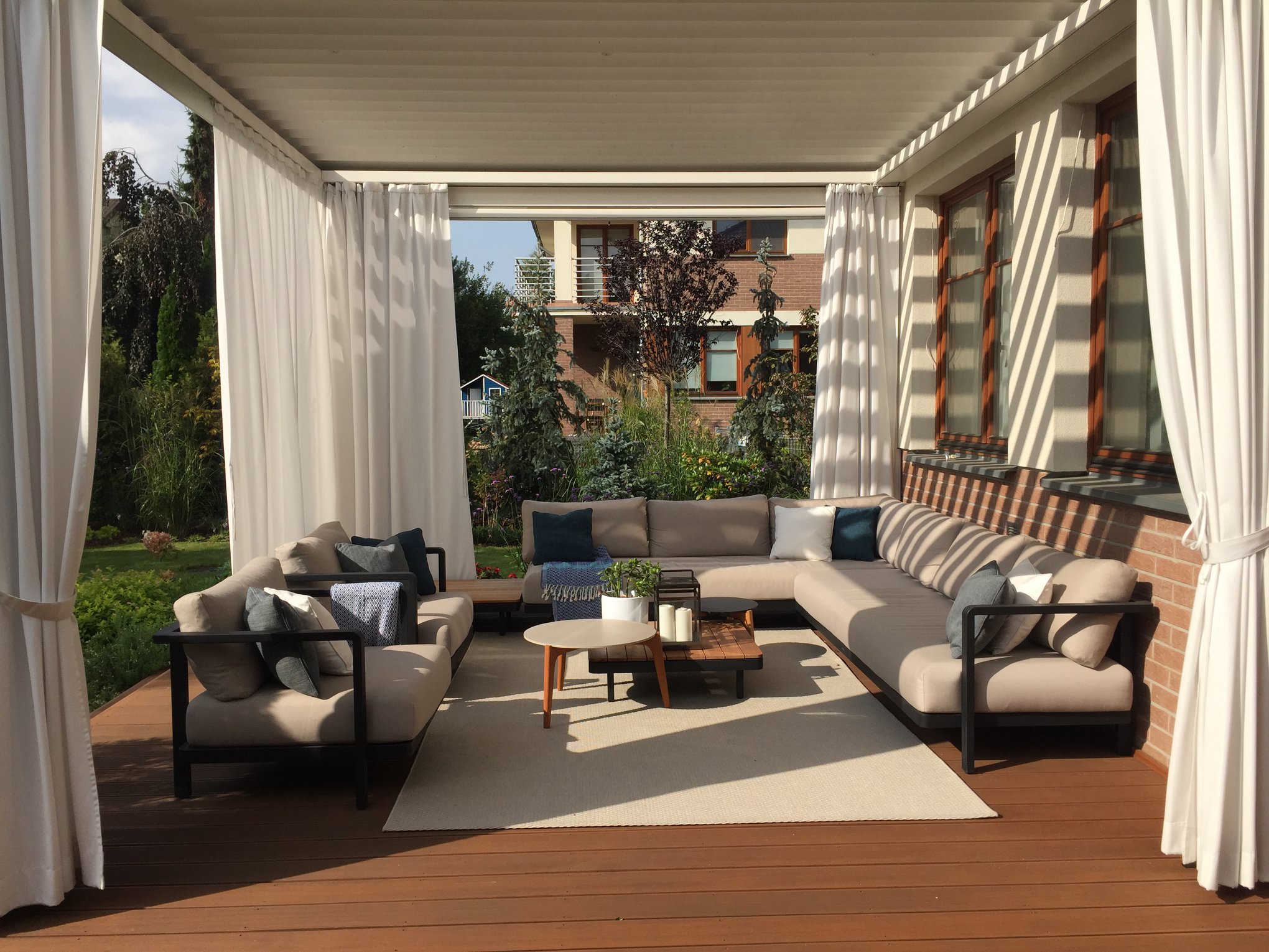 Kolorystyka osłon może współgrać z elewacją budynku lub stanowić kontrastujący akcent. Zintegrowane oświetlenie, delikatne tkaniny, donice i drewniane elementy pomogą stworzyć przytulną i nowoczesną atmosferę.